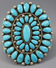 Unlike the collection of petit point pieces shown in the earlier image, needlepoint cluster designs like the bracelet above are characterized by long, thin, needle-shaped stones. Photo courtesy Audie Yazzie.