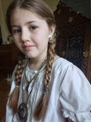 One of the most characteristic forms of Navajo jewelry is the Squash Blossom necklace. The naja found at the center of squash blossom pieces was inspired by the Moorish-influenced crescent moon shapes that adorned the bridles of the horses of Spaniards that visited Navajo villages. Likewise, the “squash blossom” we refer to is a nod to the pomegranate blossoms so popular in Spanish art and imagery. Click here to read more about Navajo jewelry styles.